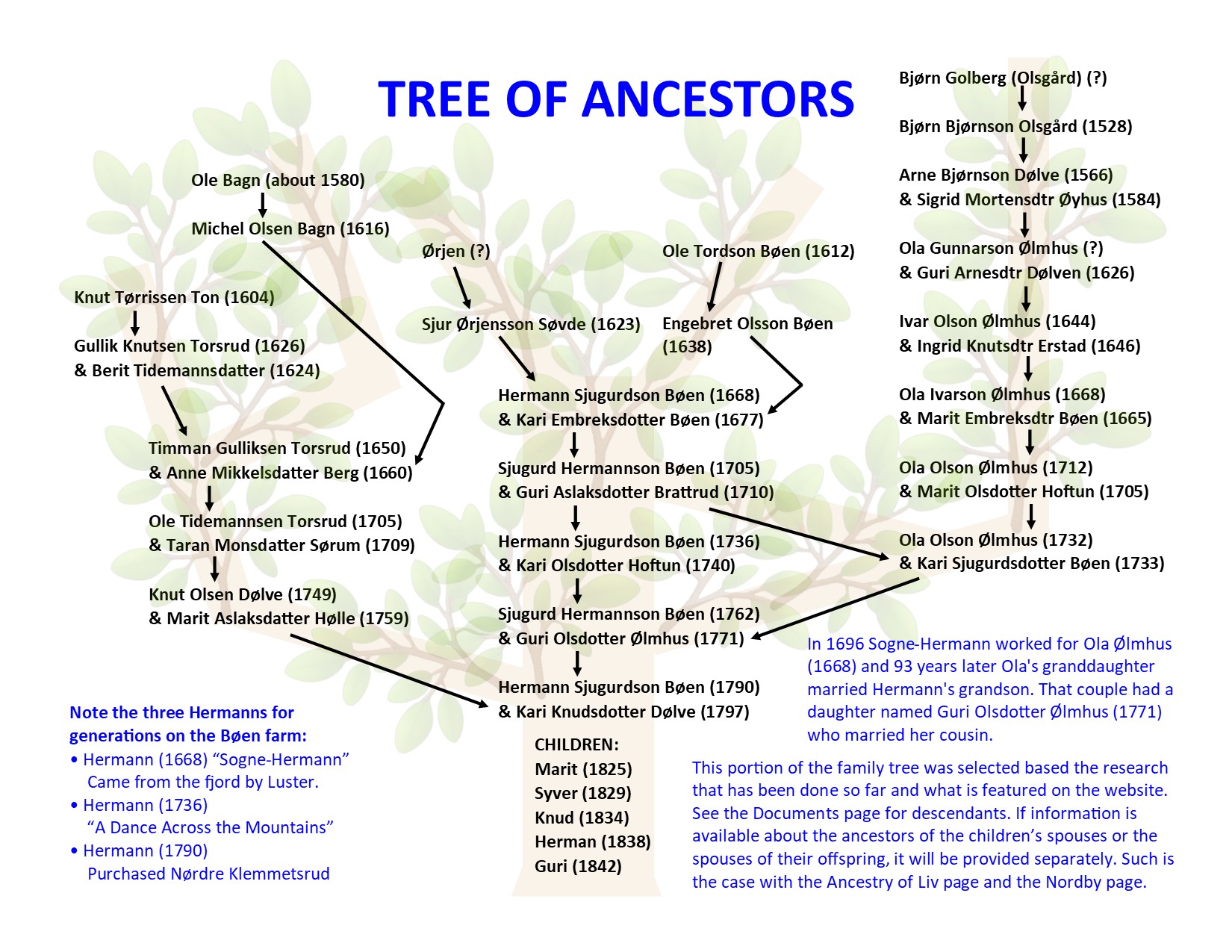 Our family history at the Bøen farm goes back to Ole Tordson Bøen born in about 1612. He had a son named Engebret Olsson Bøen born about 1638. His daughter, Kari Embreksdotter Bøen (born in 1677), married a man named Hermann in 1704. It was said that he came “from north of the mountains” and was referred to as “Sogne-Hermann” because he came from the fjord called Sognefjord. He purchased part of Kari’s home farm in 1709 (map showing location of farm) and more of it in 1723. Bøen translates to meadow or homestead. Bø is a very old Norse word for farm. Bøen sounds like “burn”. From Google Translate: AUDIO SAMPLE