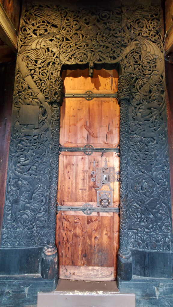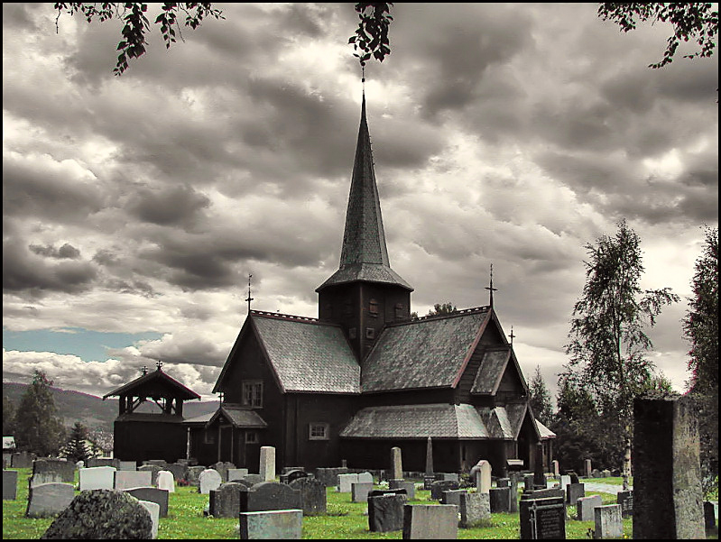 The Hedalen stave church was built in about 1160. In 1699 it was expanded into the cross-shaped church that you can see in the photo.  A bearskin that hangs inside once belonged to a bear shot by two hunters who happened upon that area. As a result of their hunt, the church was rediscovered after a plague had killed all the residents and left the village desolate for 150 years. Legend has it that one of the hunters shot at a bird and missed. The arrow struck a church bell. They must have been surprised to find a church in the middle of a forest. For superstitious reasons, one of the hunters that discovered the church threw his flint and steel over the roof. The ground where it landed was named Ildjarnstad meaning firesteel place.